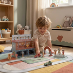 Il playset stimola logica, creatività e motricità fine: i bambini costruiscono la pista, posizionano gli elementi e creano situazioni di gioco simbolico, in linea con un approccio Montessori.