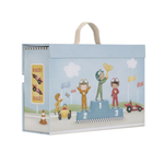 • Pista macchinine in legno e cartone integrata nella valigetta, facile da montare e richiudere.