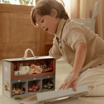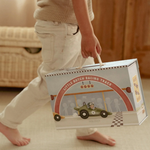 La valigetta si apre e diventa una pista componibile in cartone rigido, facile da assemblare come un puzzle. La combinazione di legno FSC e cartone resistente offre un gioco solido, sicuro e adatto ai bambini dai 3 anni in su.