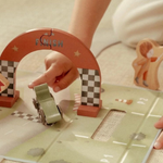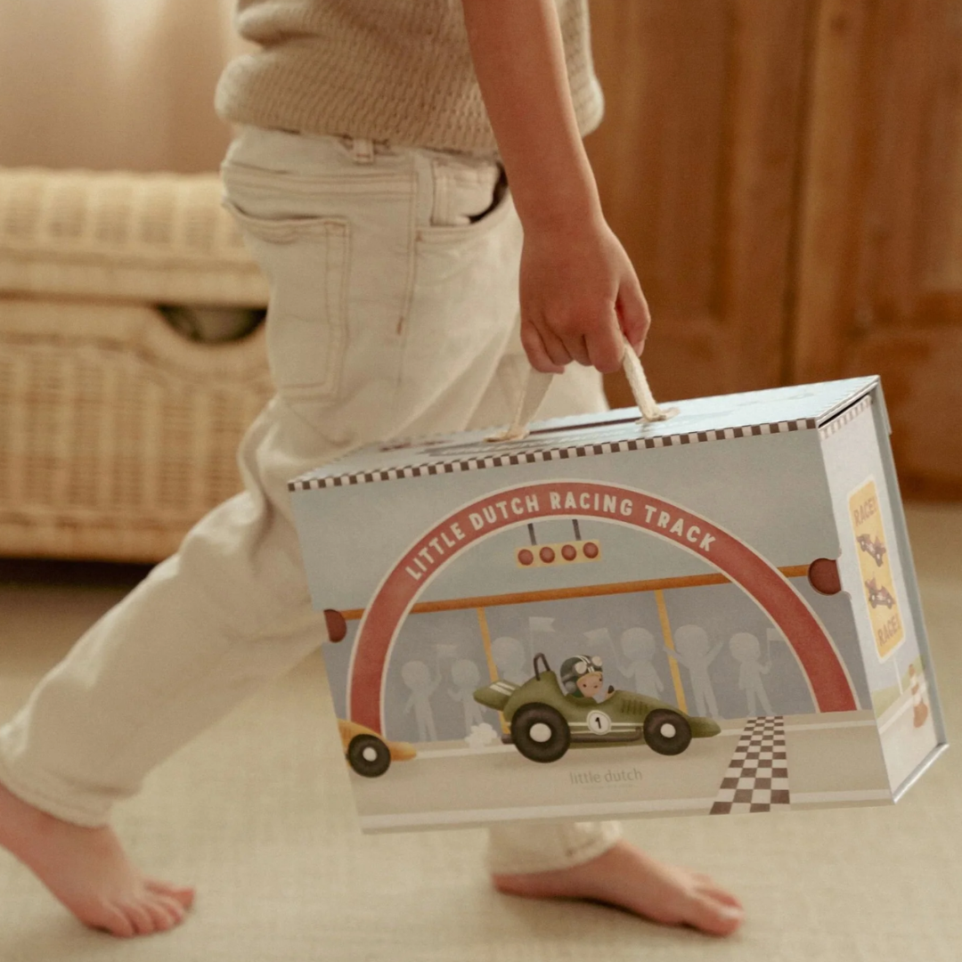 Il Little Dutch Macchinine in Legno è un playset completo composto da una pista pieghevole integrata nella valigetta, macchinine in legno FSC, piloti, podio e accessori da corsa.