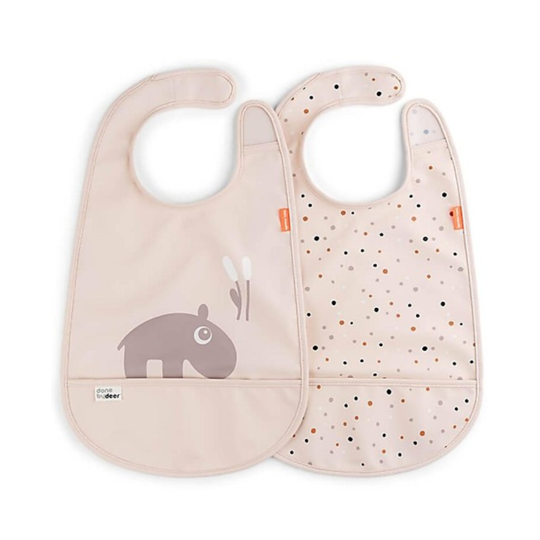 Questo set di Due Bavaglini Impermeabili con Tasca firmato Done by Beer è un'ottima scelta per la tua bambina durante i pasti. Impermeabile, facile da pulire e dotato di una tasca raccogli briciole, è l'ideale per la fase dello svezzamento.